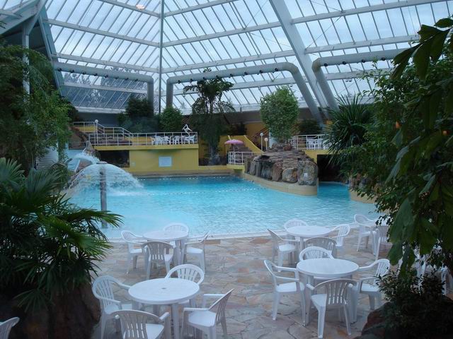 Blick auf das große Becken mit Wellenfunktion, rechts ein kleineres Becken mit Strudeln, links die Wildwasserbahn